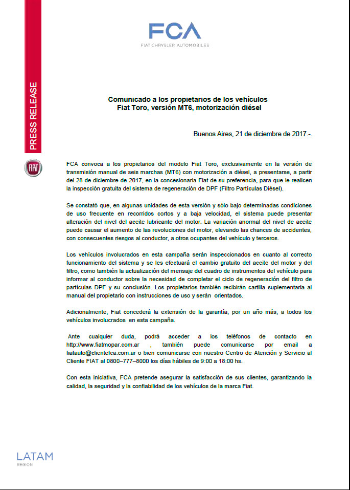 Finalmente hoy se publica un comunicado (ver original al final de esta nota) a los medios de difusión, con fecha del 21 de diciembre, en el que se señala que «FCA convoca a los propietarios del modelo Fiat Toro, exclusivamente en la versión de transmisión manual de seis marchas (MT6) con motorización diésel, a presentarse, a partir del 28 de diciembre de 2017, en la concesionaria Fiat de su preferencia, para que le realicen la inspección gratuita del sistema de regeneración de DPF (Filtro Partículas Diésel)»