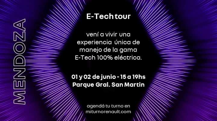 Este 1 y 2 de junio el E-Tech Tour llega a Mendoza. Renault Mediterráneo prepara un puesto en el Parque General San Martin. Allí de 15 a 19 horas se podrán testear desde el nuevo Renault Megane E-Tech hasta el Renault Kangoo E-Tech.